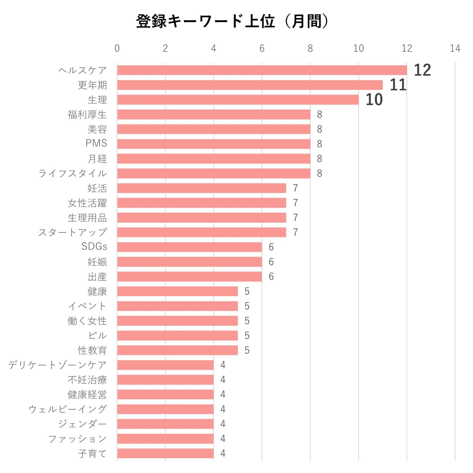 キーワードの登録数をみると、「ヘルスケア」「更年期」「生理」に関する記事が多く、とくに今月は、「更年期」や「生理」に関するアンケート調査が目立ちました。上位キーワードの「ヘルスケア」「更年期」「生理」と、「PMS」「月経」「福利厚生」などのキーワードにも注目することで、“女性特有の身体の悩み”に対しての向き合い方や働く女性の健康課題をサポートする、フェムテックサービスの検討・導入などが増えた理由が見えてきました。