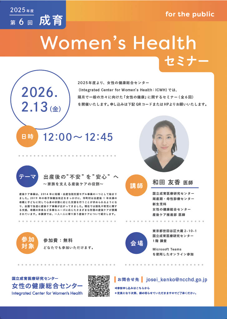 2月13日開催!「第6回 成育Womenʼs Healthセミナー」テーマは \産後ケア/ 【女性の健康総合センター】