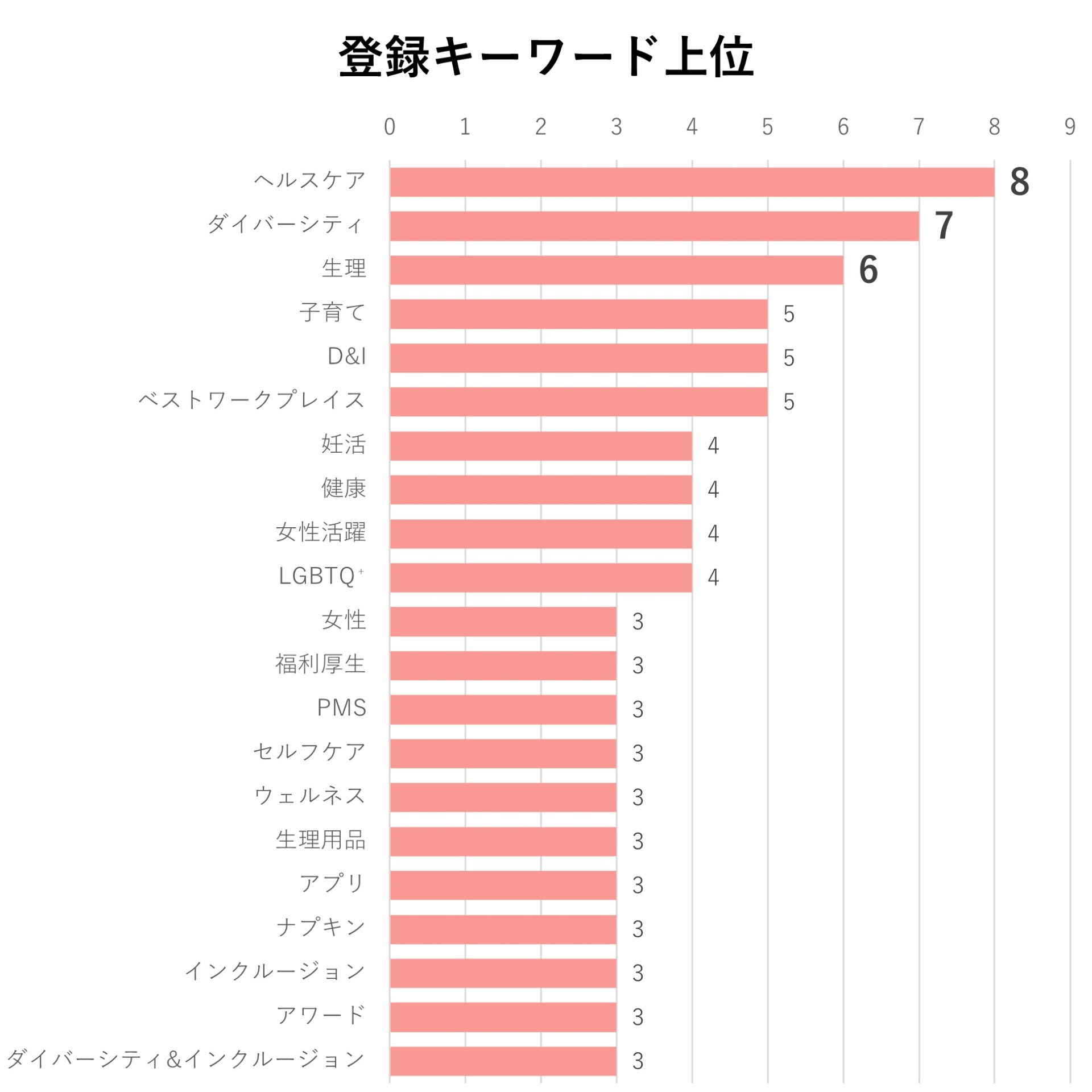 登録キーワードでは「ヘルスケア」が8本、「ダイバーシティ」が7本、「生理」が6本でした。