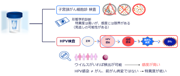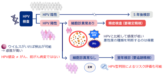 HPVには200種類以上の型があり、そのうち子宮頸がんの原因になるのは「高リスク型」と呼ばれる14種類の型と言われています。HPV陽性だからといって必ずしも子宮頸がんになるわけではないため、「がん」への進展リスクの高いHPVに感染しているかどうか、あるいはがんになる前の前がん病変や初期段階のがんを、早期発見することが重要です。