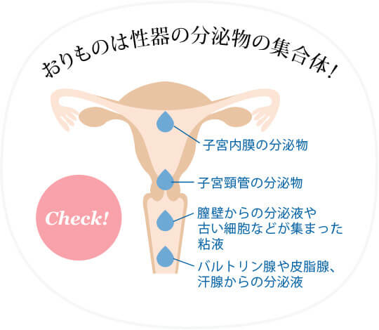 おりものとは、その名の通り、女性のからだから自然とおりてくる(分泌される)粘性のある液体で、子宮や腟からの分泌物や古くなった細胞の老廃物などが含まれています。排卵期を中心に、量や質が日々変化する現象で、ごく自然な事です。