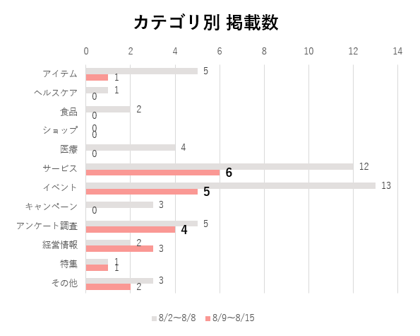 カテゴリ別では、「サービス」が6本、「イベント」が5本、「アンケート調査」が4本。