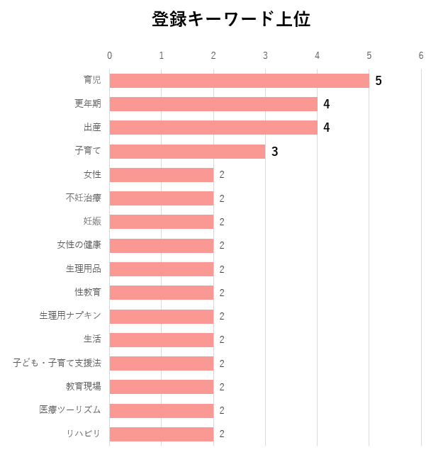 登録キーワードでは、「育児」が5本、「更年期」「出産」が同数の4本、「子育て」が3本でした。