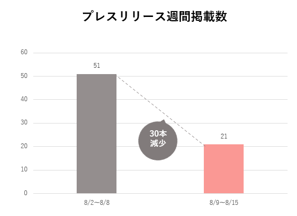 今週のフェムテック領域に関するプレスリリース掲載数は21本で、前週から30本減数です。お盆期間中により、それぞれの活動が一休みしたものと思われます。