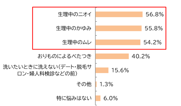 ピップの調査によると、20代~40代女性のデリケートゾーンの悩みは「生理」のニオイやかゆみ、ムレ