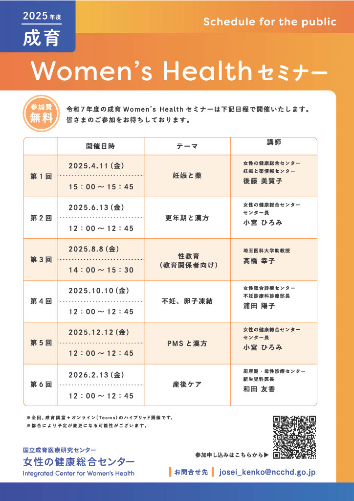 女性の健康総合センター(国立成育医療研究センター 東京都世田谷区)では、隔月で一般の方々に向けた「女性の健康」に関する無料セミナーを開催しております。