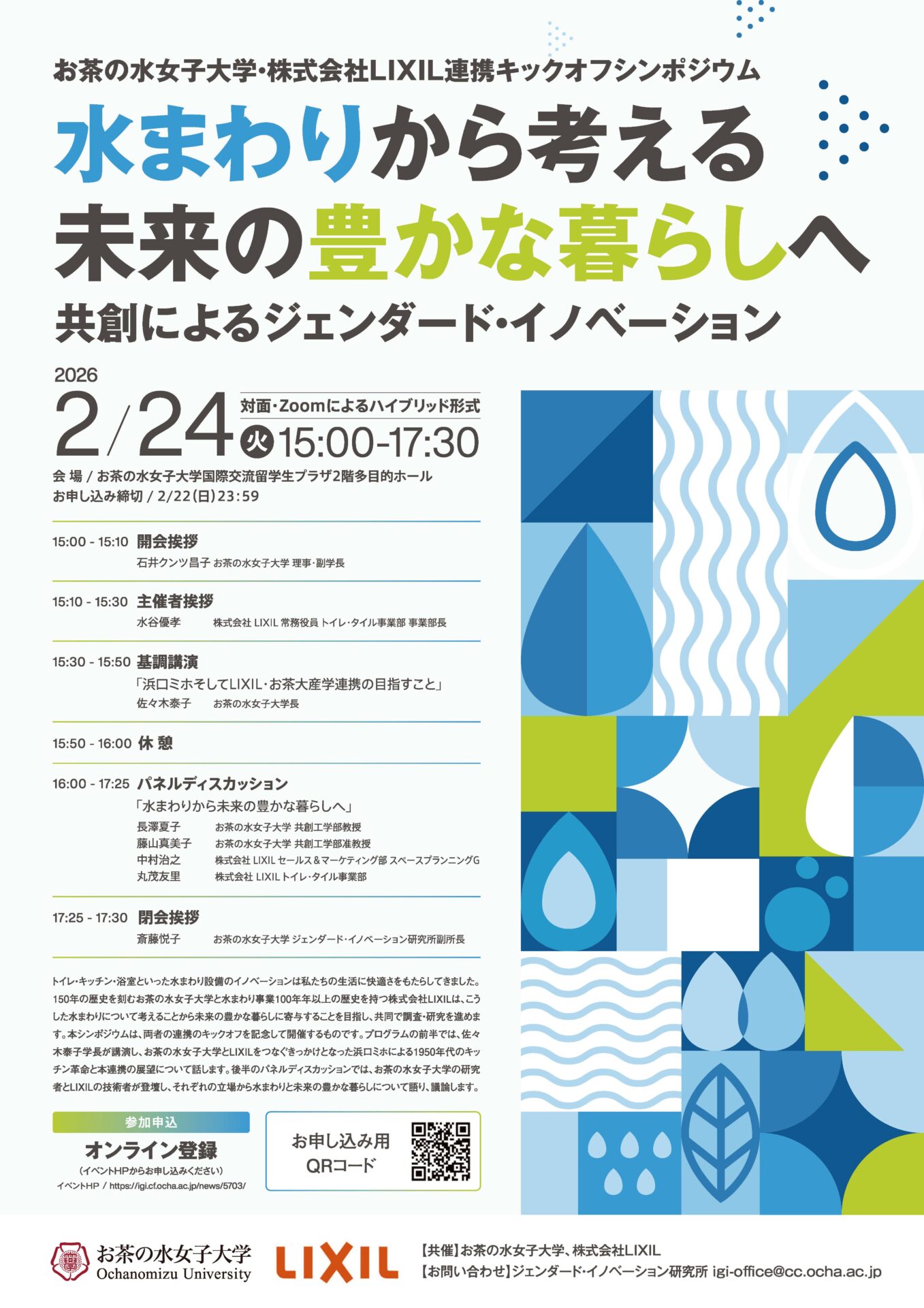 2026年2月24日、両者は連携キックオフシンポジウム「水まわりから考える未来の豊かな暮らしへ:共創によるジェンダード・イノベーション」を開催、当日は現地44名、オンライン71名の参加者が集まりました。