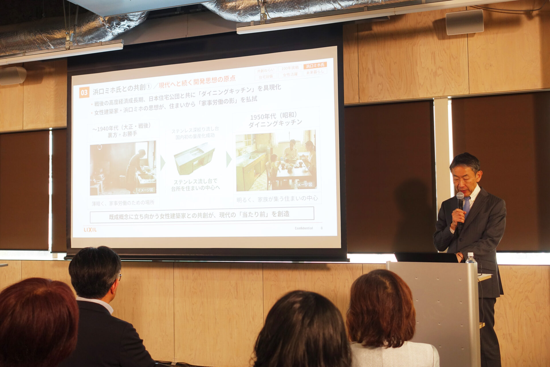 主催者挨拶でLIXIL・水谷優孝常務役員は、今回の連携を「水まわり商品の開発にとどまらず、社会のあり方や私たちが無意識に抱えるバイアスを見直す挑戦」だと位置づけました。象徴的な存在として浜口ミホ氏を挙げ、北側の暗く湿った台所で女性が孤立しがちだった状況を、ダイニングキッチンの発想と動線分析などの科学的アプローチによって変え、台所を家の中心へ引き出した革新だったと説明しました。その精神を受け継ぎ、お茶の水女子大学とともに、誰もが安心で心地よく自分らしくいられる住まいの風景をつくっていきたいと語りました。