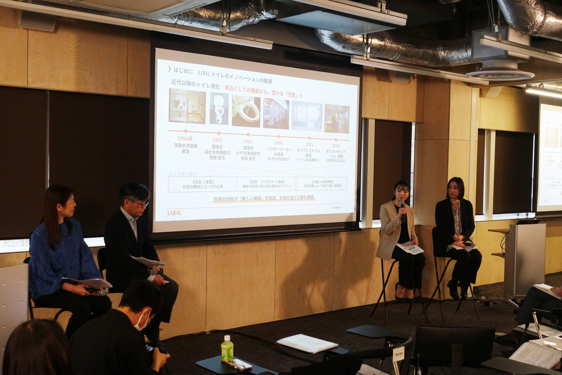 1部はLIXILの水谷優孝常務役員の挨拶と、お茶の水女子大学の佐々木泰子学長からは日本初の女性一級建築士として知られる浜口ミホ氏を中心にキッチンの歴史についての基調講演。2部はトイレを題材にジェンダード・イノベーションを「社会実装」へどうつなげるかについてのパネルディスカッションが行われました。