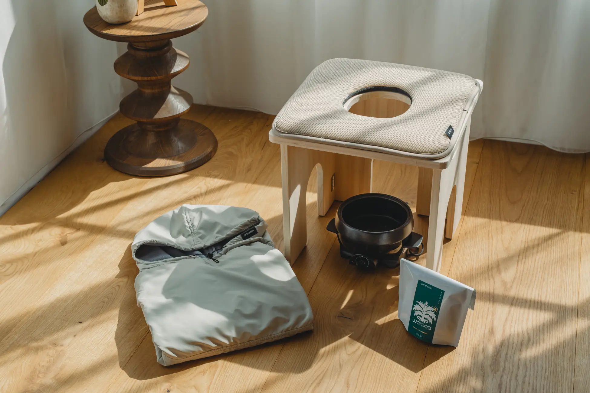 よもぎをはじめとした薬草やハーブを煮出し、立ち上る蒸気を下半身から取り入れることで、からだを芯から温め、めぐりを整える「よもぎ蒸し」。約600年前から続く伝統的な温熱ケアを、自宅で日常的に続けられるよう再設計したのが、wamcaの「自宅よもぎ蒸し用スターターセット」です。換気ができる畳半畳ほどのスペースがあれば、リビングでも脱衣室でもどこでも利用できます。