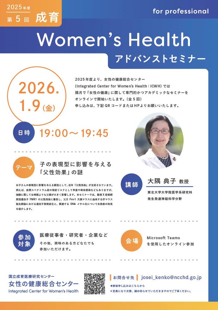 1月9日(金)開催!「第5回 成育Womenʼs Healthアドバンストセミナー」テーマは《子の表現型に影響を与える「父性効果」の謎》【女性の健康総合センター】